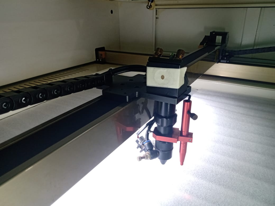 To see how the calibration is, we must observe that the mark of the laser beam is in the center of the hole in the laser head, if the two marks overlap but are above the center, it means that the height of the tube is above of the height of the laser head and the tube must be lowered.