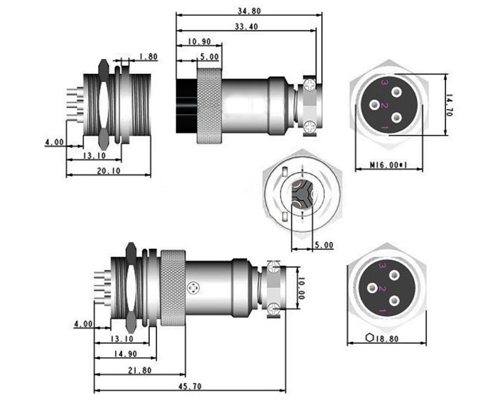 Dimensions and Pins Position for the GX20 Male & Female plug