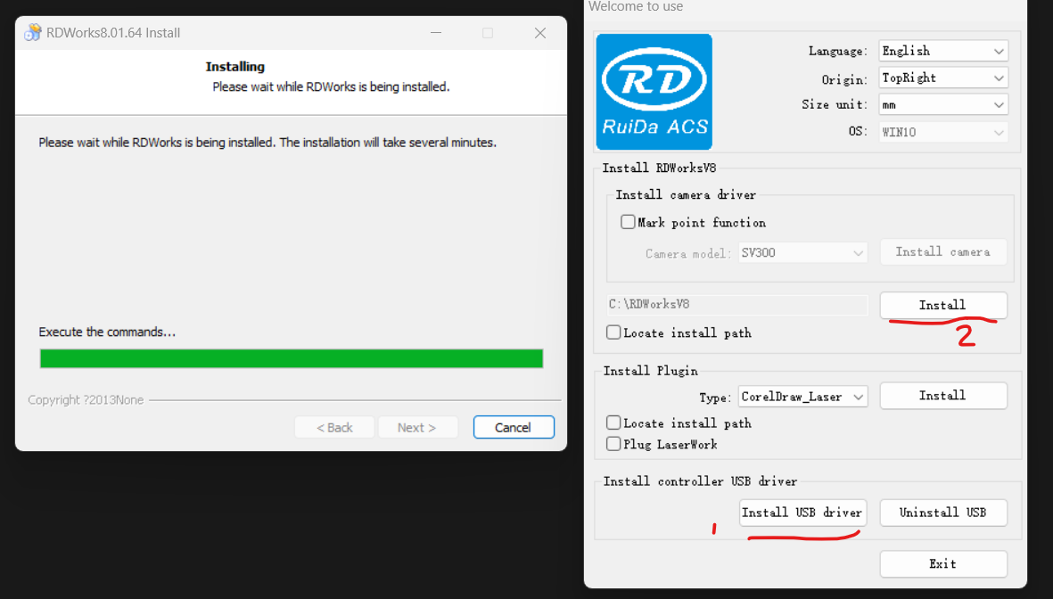 instale el software, como primer paso instale el driver USB de la controladora, y luego cambie opciones de lenguaje, origen y unidades, y termine dando clic en Install