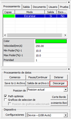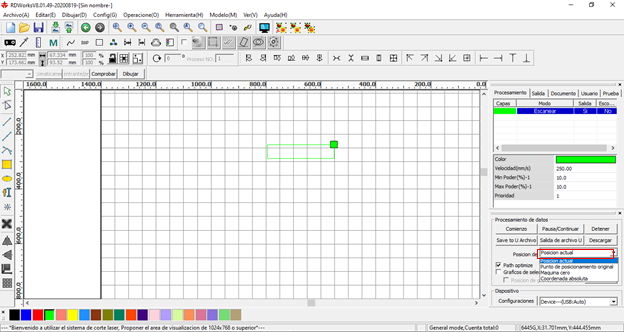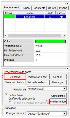 El cabezal láser hará el movimiento del marco si el movimiento es correcto, clic sobre el botón “comienzo” para iniciar el grabado o escaneo