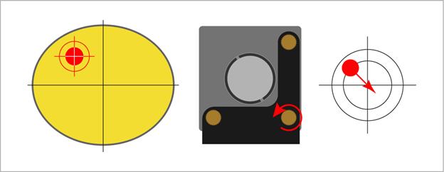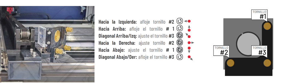 Movimiento izquierda: mueve los tornillos 1 y 3 en dirección hacia la derecha, (ajuste)