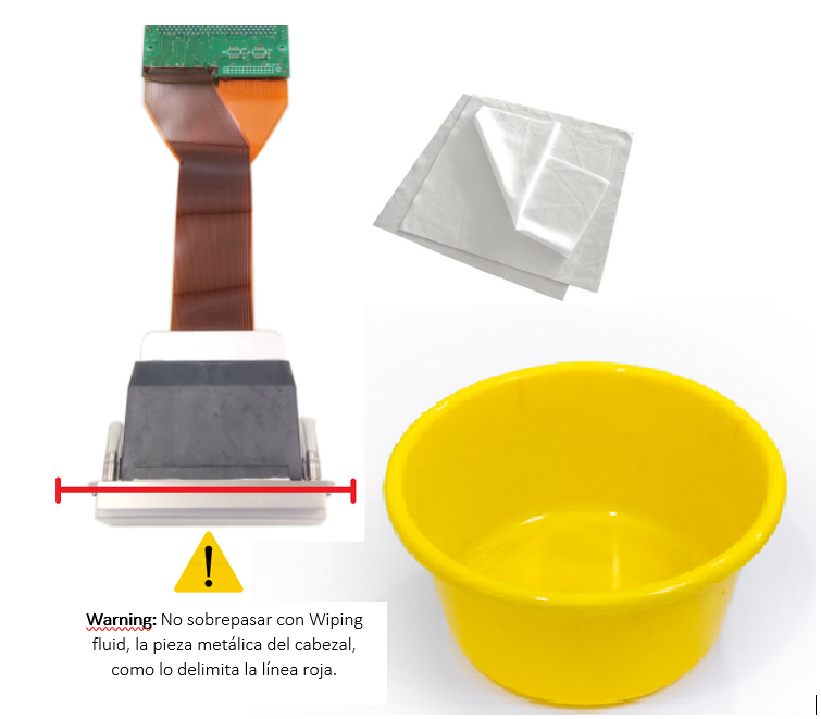 Paso 5: Verter una delgada capa de UV Wiping fluid en una tasa, colocar un paño antiestatica en el fondo y colocar el cabezal encima del paño. El liquido de limpieza NO debe sobrepasar la parte metaliza del cabezal, dejar en remojo de 24 a 72h.