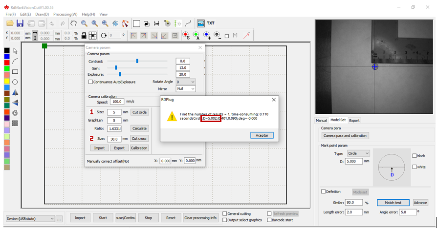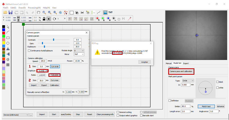 Paso 10: Una vez haya reconocido el circulo, haga clic “Match test” y memorice el valor del diámetro que aparece en la ventana emergente (D=5.043 en este caso), en “Camera para and calibration”, ubique “GraphLen” e introduzca el resultado de diámetro obtenido, luego presione “Calculate”.
