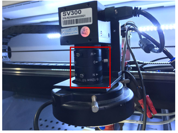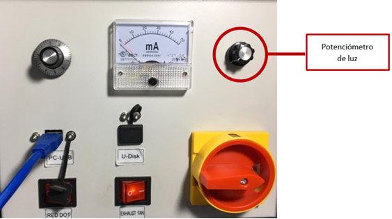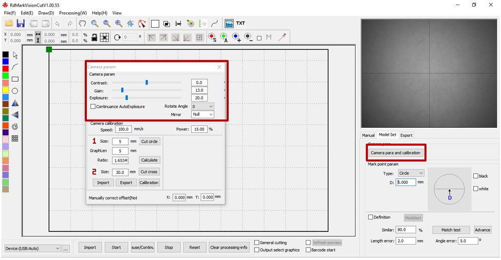 Paso 6: Presione la casilla “Camera para and calibration” y configure los parámetros de la cámara (“Contrast”, “Gain” y “Explosure”) y el potenciómetro de luz ubicado en el lateral derecho del panel de operación de la máquina, el cual potencializa la luz de la cámara, hasta lograr una visualización clara.