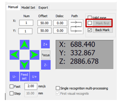 Paso 2: Ubique una hoja de papel sobre la mesa de trabajo de la máquina; en el software diríjase a la sección “Manual” para familiarizarse con las flechas de direccionamiento del cabezal láser, posteriormente ubique el cabezal láser sobre el área donde se va a cortar la marca inicial de calibración (Circulo).