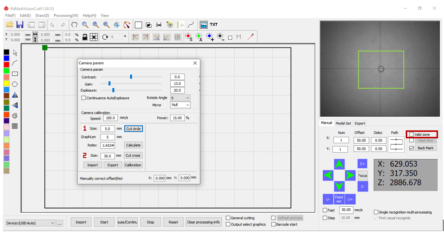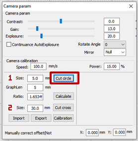 Paso 12: Realice la segunda marca de calibración (Cross), ubique el cabezal láser sobre un área diferente a la del circulo y haga clic en “Cut cross” para cortar una cruz sobre el material y verificar la alineación de la cámara.