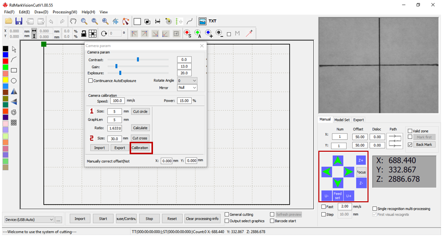 Paso 13: Mueva las flechas que direccionan el cabezal láser hasta lograr que la cruz del software se sobreponga a la cruz cortada en el material. Reduzca la velocidad de movimiento del cabezal para que el movimiento sea lento y preciso. Una vez estén alineadas las cruces, haga clic en “Calibration” para finalizar la calibración.