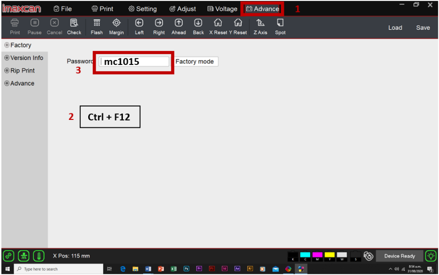 Paso 1: Ingrese al modo de fábrica dando clic en la pestaña “Advance”, ubique el cursor sobre la casilla en blanco “Password” y presione Ctrl+F12 para cambiar a modo de fábrica; Introduzca en password mc1015 y presione Enter, imagen1.