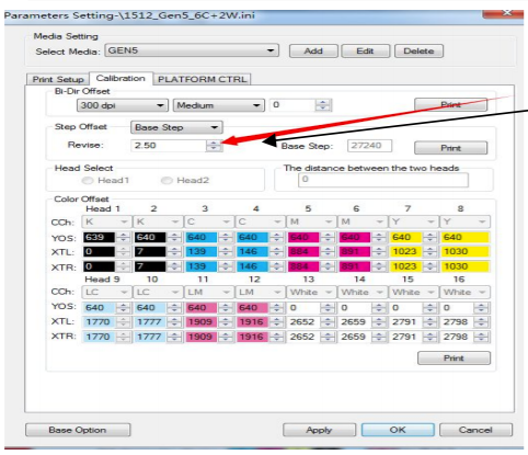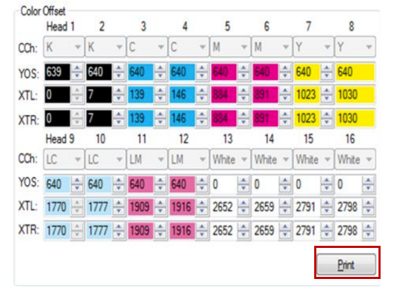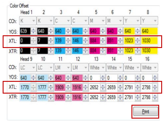 Note: In case of performing the calibration a second time: add or subtract the new position value (generated by “Left print” and “Right print”) in the boxes of each color corresponding to XTL.