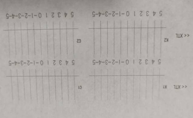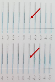 XYL corresponds to the left print, you need to identify the position where the black reference line overlaps the colored line. Each color is referenced by K1,K2, C1,C2, M1,M2, Y1,Y2 and the white is referenced with w11, w12, w21, w22, w31, w32 ....