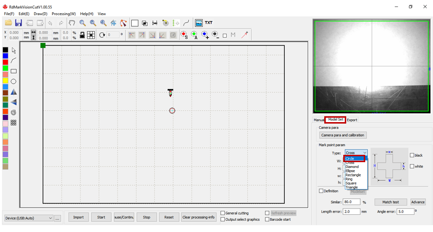 Step 4: Locate the “Model Set” section and determine the initial calibration mark by clicking on the drop-down menu identified as “Type”. Select the "Circle" option.