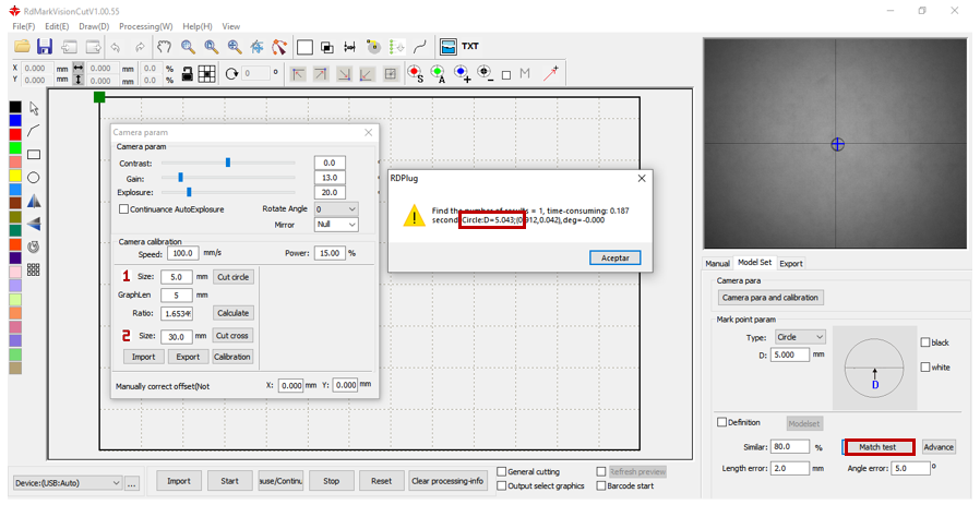 Step 10: Once you have recognized the circle, click “Match test” and memorize the value of the diameter that appears in the pop-up window (D = 5,043 in this case), in “Camera para and calibration”, locate “GraphLen” and Enter the diameter result obtained, then press “Calculate”.