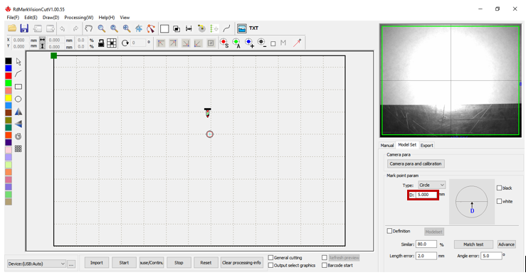 Step 8: In the "Size" field, enter the diameter of the circle defined in step 5, click on "Cut circle" so that the machine cuts it on the material. Once cut, position the camera on the circle.