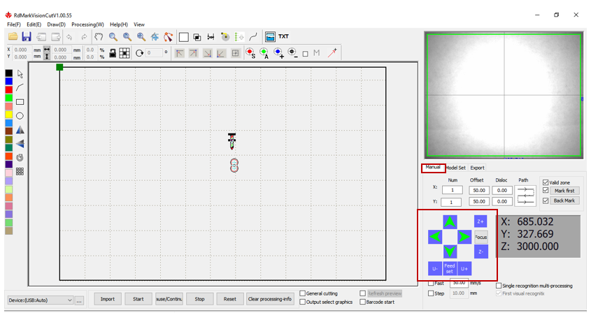Step 2: Place a sheet of paper on the work table of the machine; In the software go to the “Manual” section to familiarize yourself with the direction arrows of the laser head, then place the laser head over the area where the initial calibration mark (Circle) will be cut.