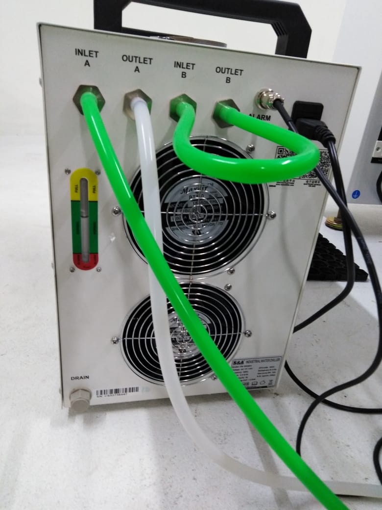 For the dual chiller inlet use only one inlet A, loop a hose in inlet B and outlet B. filled with distilled water until reaching the green level on the gauge.