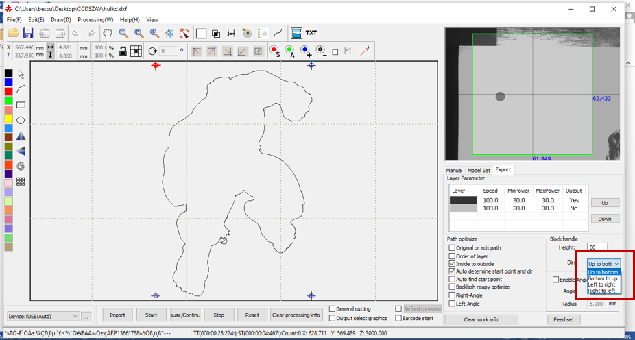 Step 9: Set the cutting direction using the drop down menu in the “Dir” box. (Eg "Up to bottom", if you want the cut to be made downwards).