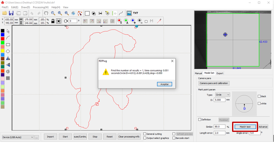 Step 4: When the camera identifies the desired pattern, click "Match test" again to perform the circle calibration.