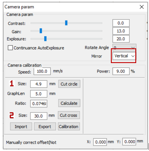 Step 3: In the software select “Circle” and press “Match test” for the camera to identify the pattern.
