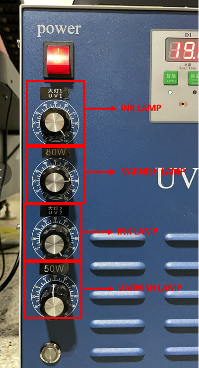 - The potentiometers that control the drying of the Varnish, denoted by 80W and 50W, are generally set in heats of 30 to 50%, however, this depends on the Varnish finish that the client requires.