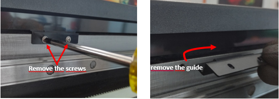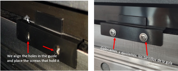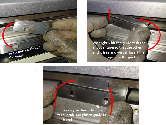 With the guide loose we proceed to reposition the encoder tape, taking one end of the guide and insert the encoder tape first in one end of the guide and carefully without letting it come off, we do the same at the other end of the guide, lifting a little bit the encoder tape inside the plastic guide so that it is on top and we can insert it easily, verifying that the encoder tape is aligned in its position.