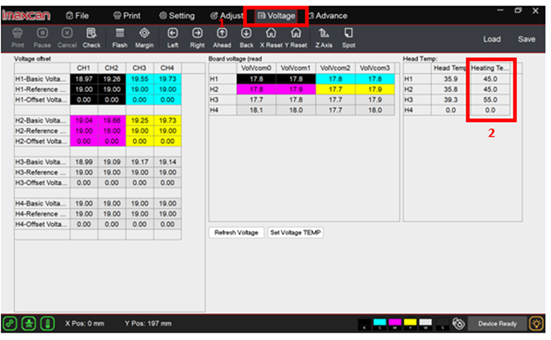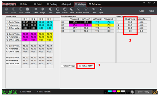 Step 2: Press the “Set voltage TEMP” tab and wait for the values in the “Head Temp” column to reach the set values.