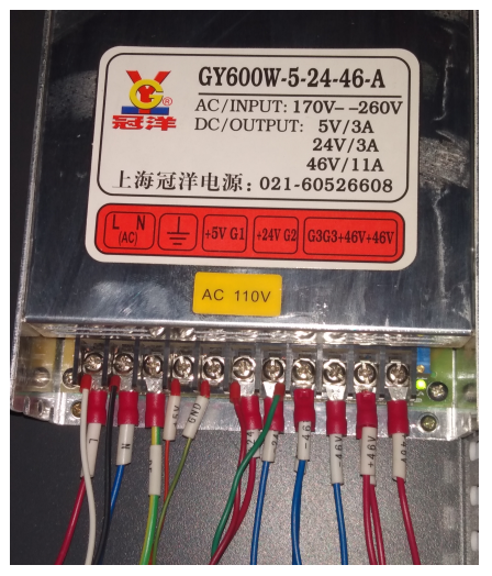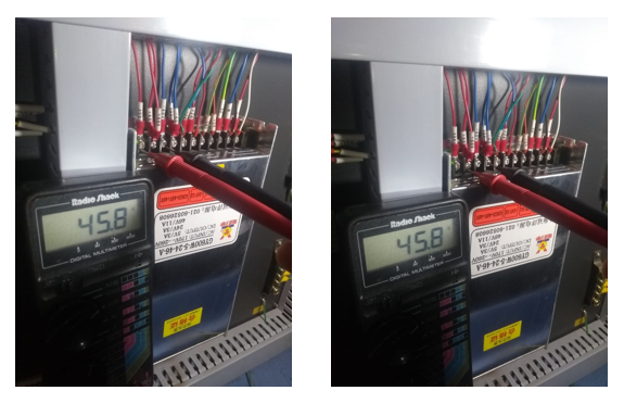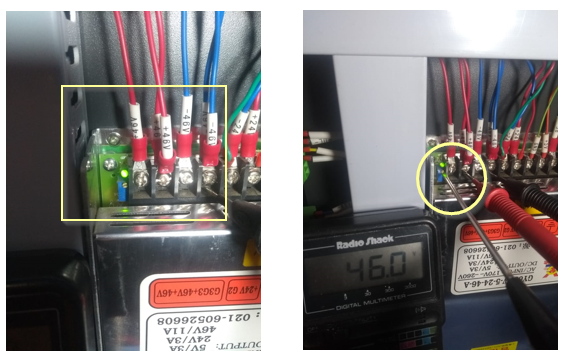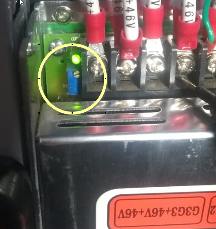 Find the 46V DC output connection, With a multimeter take the voltage measurements on the 46V connectors, if the voltage is different, it must be adjusted
