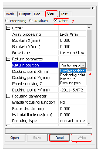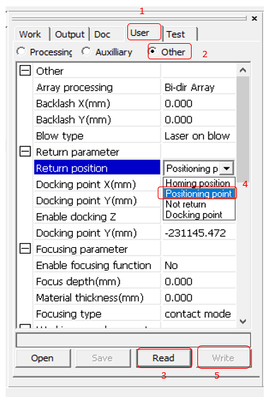 Si requiere que el cabezal se desplace a una coordenada específica se debe seleccionar la opción “Docking Point” y colocar las coordenadas tanto en el eje X como en el eje Y donde queremos que se ubique el cabezal luego que termine el corte, confirme escribiendo el parámetro a la máquina con el botón “Write”