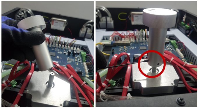 Instale el tornillo de movimiento del eje Z, afloje los tornillos al costado usando una llave Allen de 1.5 mm e introdúzcalo en el eje del motor, luego ajuste los pequeños tornillos, dejando el tornillo Z firme en el eje del motor.