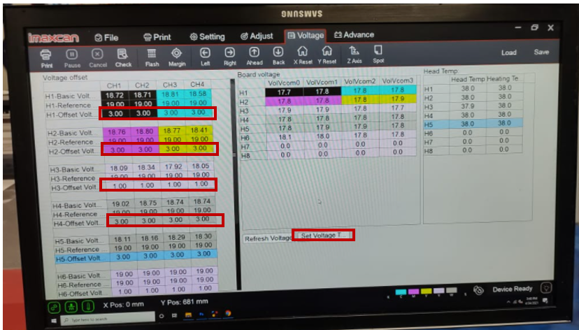 To perform a change in these parameters we click the Voltage tab on the PrintExp software. Voltage changes are to be made on the Voltage offset section. You can modify the voltage individually for each printhead in the section shown in the next picture