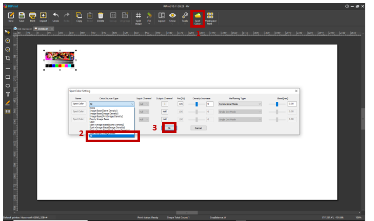 Paso 2: En la casilla “Spot color” seleccione el modo de impresión deseado.