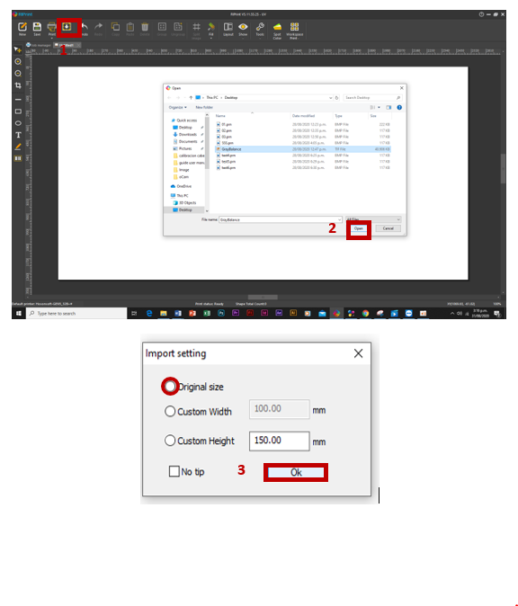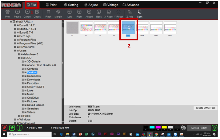 Paso 4: En el software IMAXCAN, presione la casilla “File” y abra la imagen guardada anteriormente, posteriormente haga clic en “Print” y finalmente en “Start printing”.