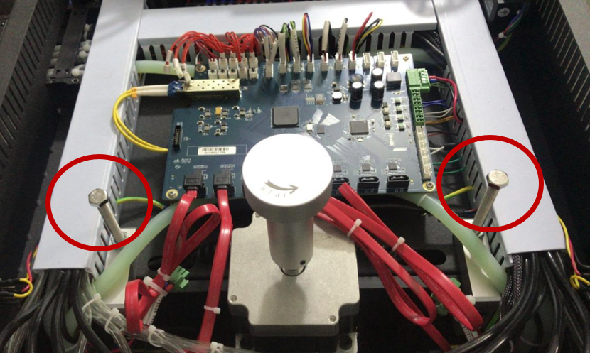 Using a Phillips screwdriver, the top cap of the print head is removed. With a ½ ’wrench remove the two screws, so that the print carriage can be raised without problem and you can remove the foam under it. The screws can be seen in the following image: