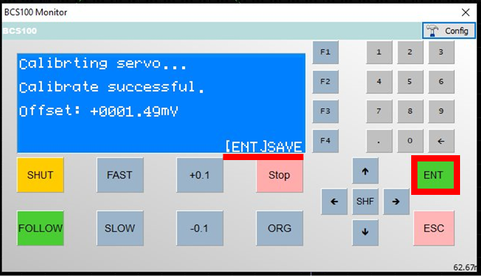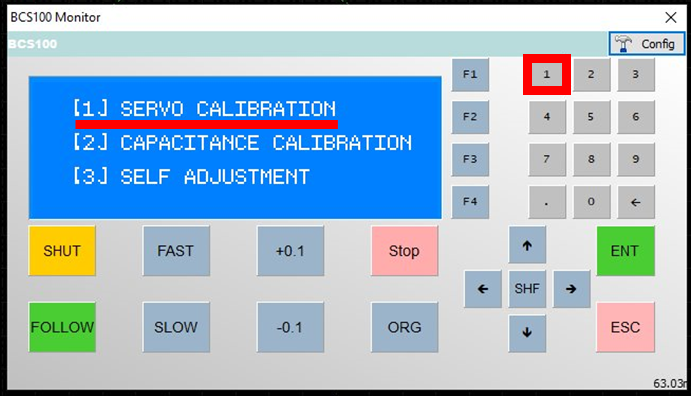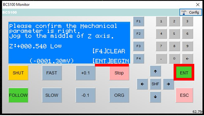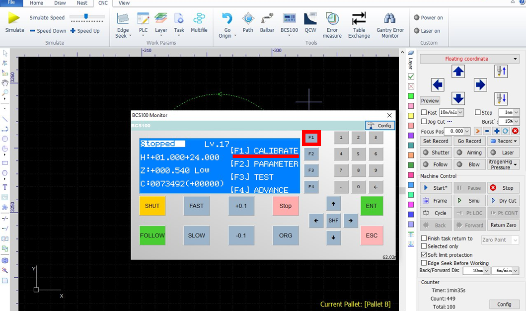 1. Press click on "CNC", then "BCS100" and "F1" on the software to begin the calibration process: