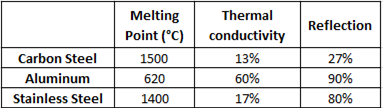 As you can see we need more temperature to melt the carbon steel, that´s why we use the oxygen to cut it because this gas provides less cooling than the nitrogen while the laser is going through the material. That means that the utilization of oxygen provides the temperature necessary to cut the carbon steel. Also, the thermal conductivity of this material is low, which means that we have to cut it slow because the heat inside the material is expanding really slow, but it doesn’t mean that it´s not going to get hot and finally, the reflection on this material is very low, so no problem with this.